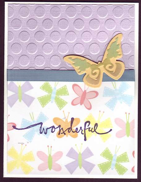 I embossed the butterfly die-cut and stippled chalk ink onto it using the die as a stencil to add some color to the butterfly. Kind of a lot of colors going on it, but I guess that makes it cheery.