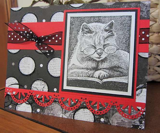 I made this card for Stampin’ Cat Studio to showcase this extremely CUTE cat stamp and the cool BoBunny paper. If you look closely you can see the black glitter on the paper. Very pretty. Lisa is still laughing at me and my reaction to the kitty! Thank you for your visit.