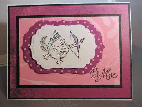 I was inspired by a tutorial on Operation Write Home Stars and Stamps to make a layered card. I am making Valentines to send off to the troops right now, so I thought I’d use one of my Fluffles stamps for this one! I colored Fluffles with Copic Markers and added several layers to the card to make colors stand out. Thanks for visiting.