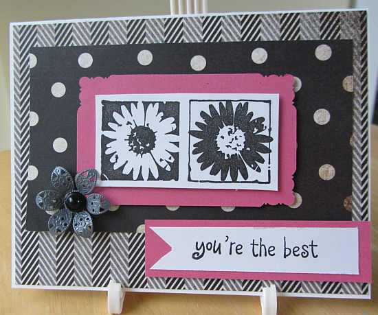 I made this card for the OWH Color Challenge: Black and White with a splash of another color. I used a bright pink accent with the black and white papers for lots of contrast. I really like the formula of black and white plus one–it always looks very elegant. Thanks for visiting.