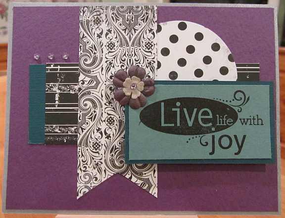 I used the current sketch, #222, at Mojo Monday as my inspiration for this card. I combined teal and purple for an interesting color pallette. I’ve used three different patterned papers, all from the BoBunny “Enchanted” collection. These are all black and white, so the teal and purple brighten the card up considerably. Thanks for stopping by.