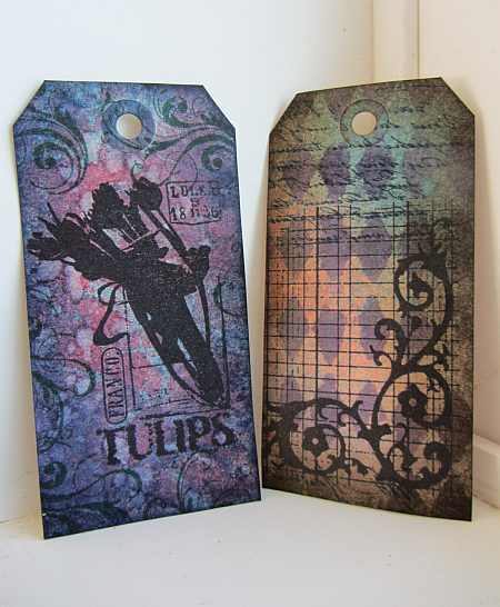 Here are some more science experiments that I’ve made as part of my Tim Holtz Creative Chemistry 101 online class. I made my own Distress Ink mists with Distress Ink reinkers. I sprayed three different colors (that was all I had!) on each tag, using a Crafter’s Workshop template. Then I added more Distress Inks (applied with blending tool). That was the background. Then I stamped images on each tag with Ranger Jet Black Archival ink. For a closer look, scroll below.