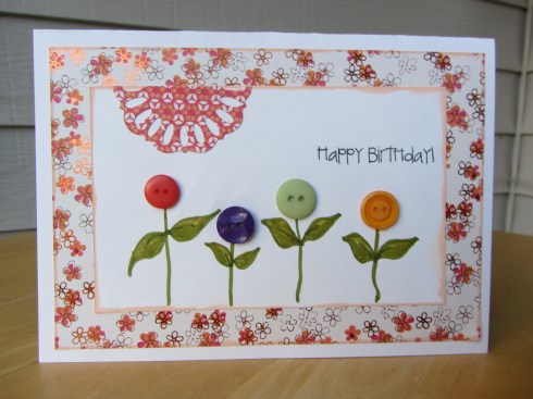 This card was totally CASED* from the Stamper’s Sampler cover (Jun/Jul/Aug 2012 issue). I made a couple of variations, but was definitely inspired by it! When I shared my copy of the magazine with one of Trenton’s teachers on our recent field trip, she admired it. I joked that her birthday was coming up, so I’d keep it in mind! Wonder if she’ll recognize it? The paper I used that is framing the images has some copper foil, which you can sort of see in the photo (upper left), making some of the flowers shine nicely. I just drew the stems and leaves below the buttons for the flowers with Ranger Distress markers. I cut the die cut in half to emulate the sun. Enjoy your day and please visit again soon.