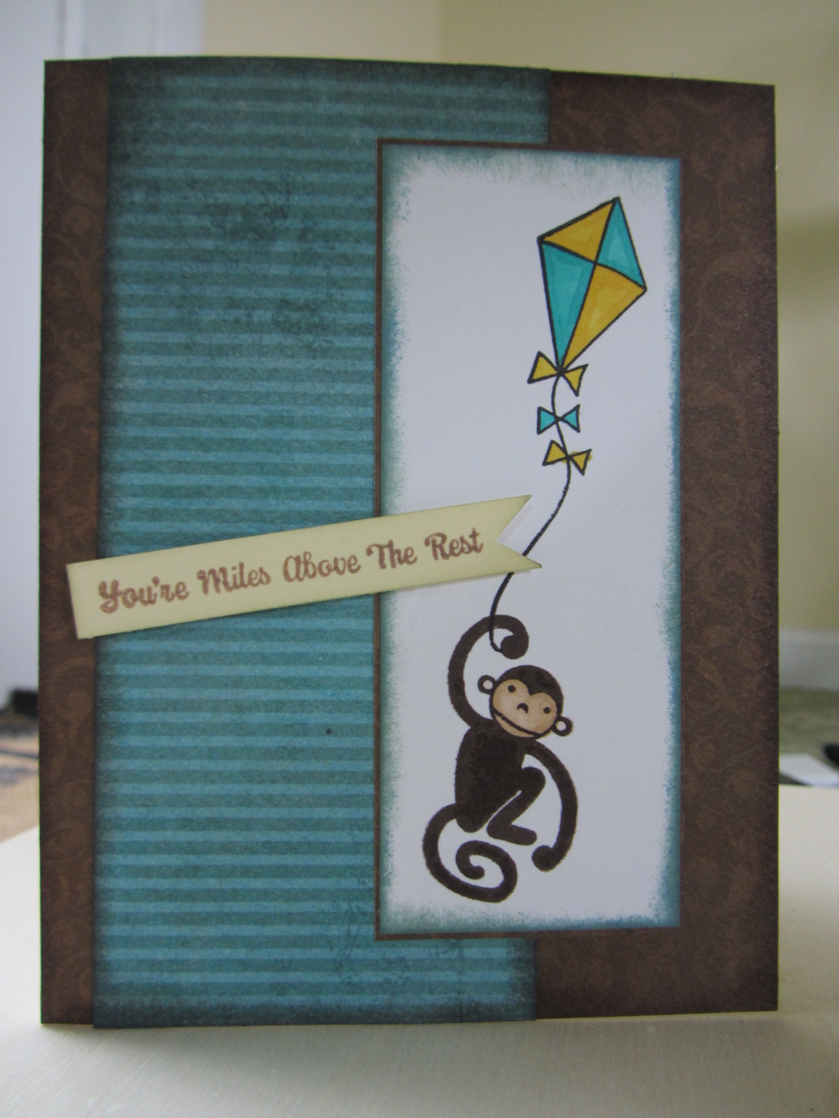 This week at Operation Write Home Stars and Stamps, the midweek throwdown challenge was to make a card featuring monkeys. I just happened to have a monkey stamp, so I decided to combine it with a kite from another set to make my own version of a flying monkey (hopefully not as creepy as those seen on the Wizard of Oz). The sentiment came from yet another set! Thanks for visiting today.