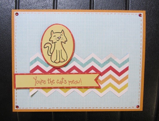I created this card from ideas offered during the first week of Online Card Classes Summer Card Camp 2 — and also ideas I gleaned from the Pattern Play class a few months ago. I used this week’s color scheme, along with one of the three sketches provided this week. I added some sparkly touches with my Sakura Gel Pens on the cat and in faux stitching around the edges. Thanks for visiting.