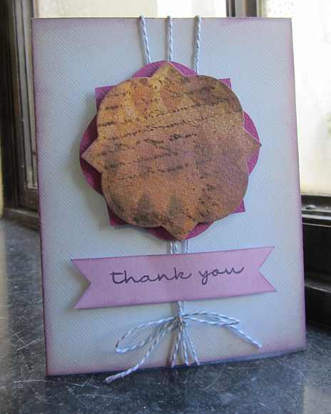 I’m taking the Online Card Classes Summer Card Camp 2, which is really packed with great information. I would highly recommend this class and have been pleased with many other classes offered by them. This week we are challenged to work with a specific color palette and three sketches, if we so desire. The color palette includes light and dark brown, light and dark magenta/purple and a light blue. I was inspired by a lesson Kristina Werner gave us and created the focal image on this card by creating a panel with Distress Inks on watercolor paper. I added some home-made spritzes of Distress ink with Perfect Pearls and layered some stamping and stenciled images. I then die cut this inkiness using a Spellbinders Vintage Label die and layered it atop a cardstock die cut a hair bigger that I offset. I created the sentiment and inked up all of the elements with chalk ink to tie together the color scheme with the lighter purple. Before I built the card, I tied baker’s twine onto the base and then applied the other elements on it using dimensional adhesive. Thanks for visiting!
