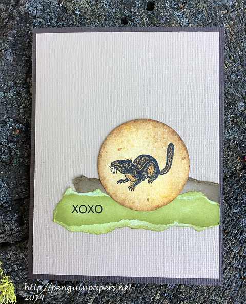 I created this simple card while out among squirrels of this kind. We went camping in Central Oregon and fed our squirrel and chipmunk friends throughout the weekend. I colored the torn cardstock with Distress Inks to match the colors around me and those I used in the chipmunk image. I used the latest sketch at Freshly Made Sketches (#146) when I put this card together. I have been taken with torn paper edges lately–it seemed appropriate to tear and color the accents for a natural feel for this card. Have a great day and thanks for stopping by.
