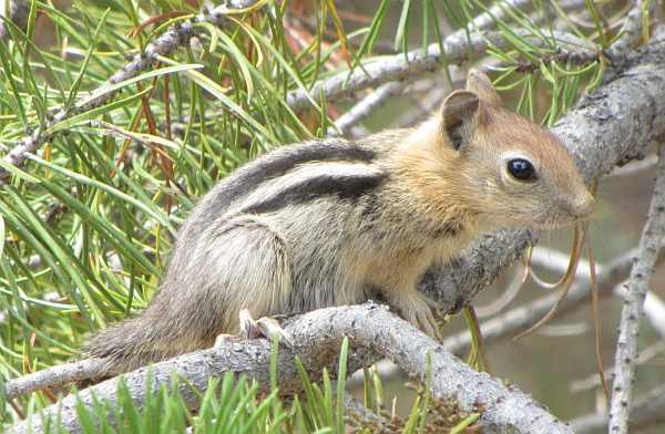 This is a baby Golden Mantled Ground Squirrel. I discovered him hanging out with his sibling and Mom (?) right by our campsite. Mom was begging for nut handouts and sitting on our laps while munching peanuts. The baby was not nearly as brazen! Is it cute or what??