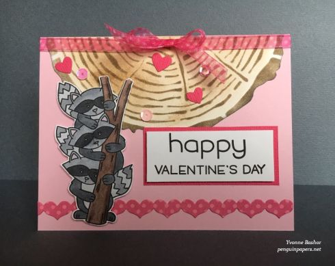 This was a fun card to make, partly because of the subject matter (more cute animals!) and also because I pulled out supplies from multiple companies. It is fun to mix it up sometimes. It was way too difficult to resist making a raccoon Valentine for my mom. Many people don’t know this, but she has several friends who are raccoons.