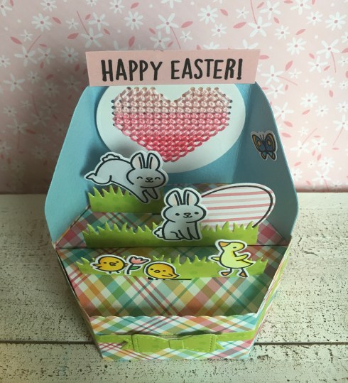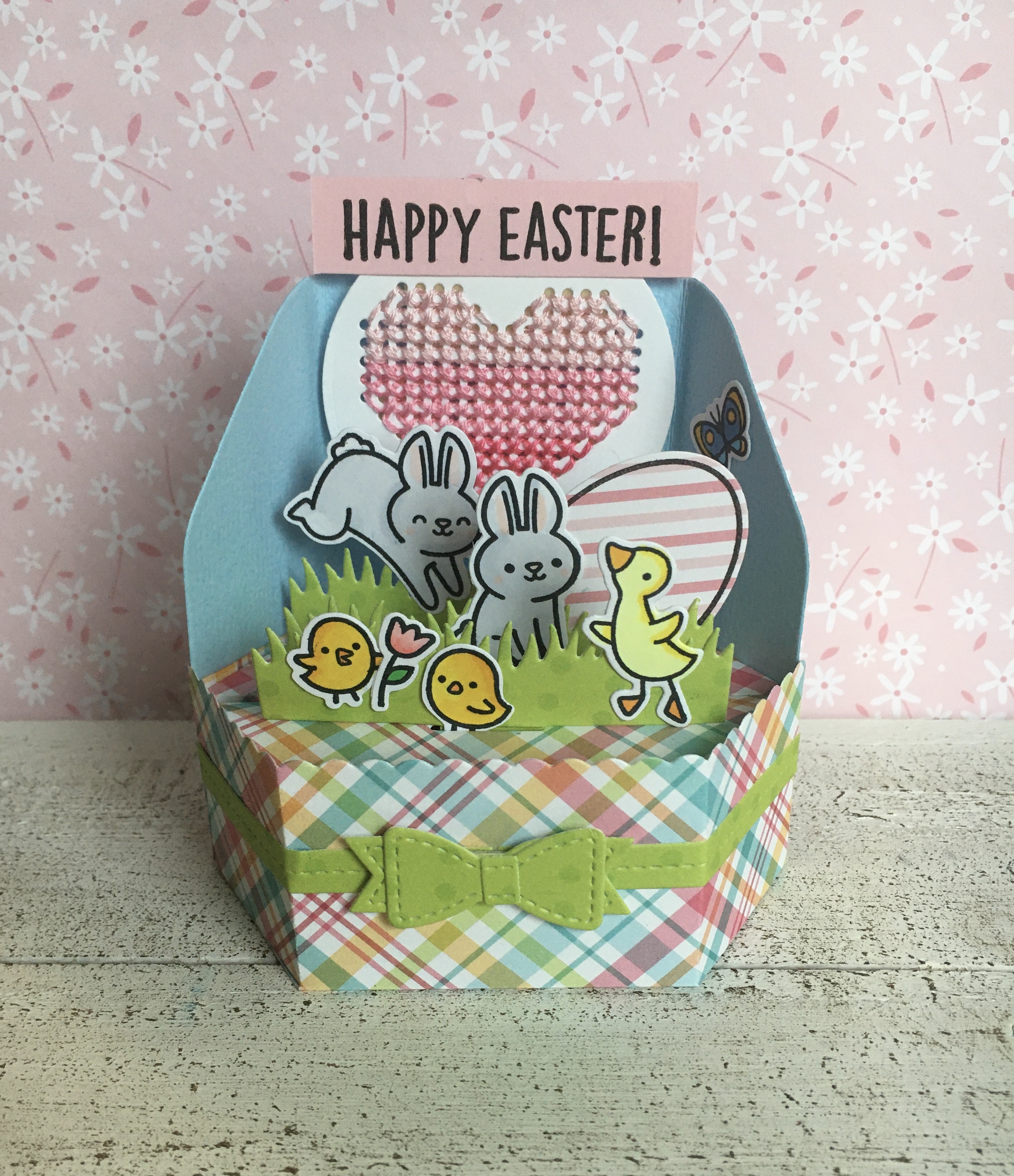 I was really anxious to do some cross stitching on one of the new Lawn Fawn Embroidery Hoop dies. I have deadline I should be designing for, but I couldn’t stand it any longer! I decided to use three shades of pink to stitch the heart for an Ombre effect. The stitching went quite quickly and I chose not to put it into the hoop part of the die set. I decided to use it for a backdrop on a Pop-up Platform with an Easter scene. These critters are so cute and I had a lot of them from the classes I taught recently. I colored them with Copic markers.
