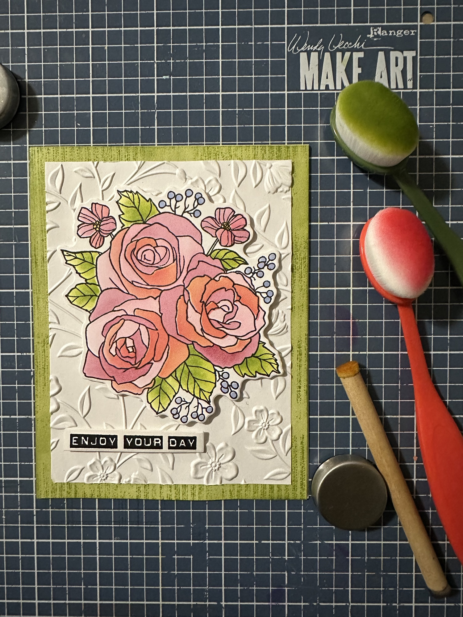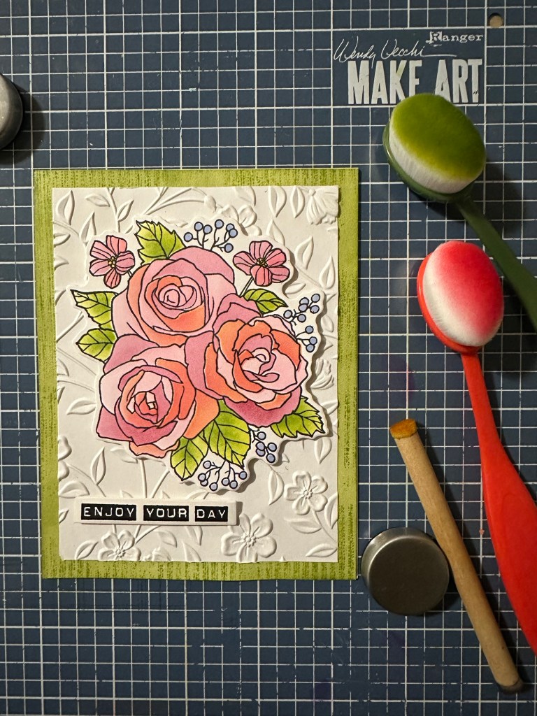 I began by stamping the floral image with a black Memento ink pad. I colored the stamped image with Ranger Archival inks using the layering stencil set. There are five stencils altogether in the set, so you can incorporate a lot of detail and many colors! I used blending brushes for laying down large areas of color, but to add some more shading and detail, I used the Detail Blending Tools (it is easiest to see on the leaves). The Archival inks The stencils line up like a dream and are very heavyweight. I used Wendy’s Make Art Staytion and magnets to hold my stencils in place and it worked beautifully as always. I never use layering stencils without it!