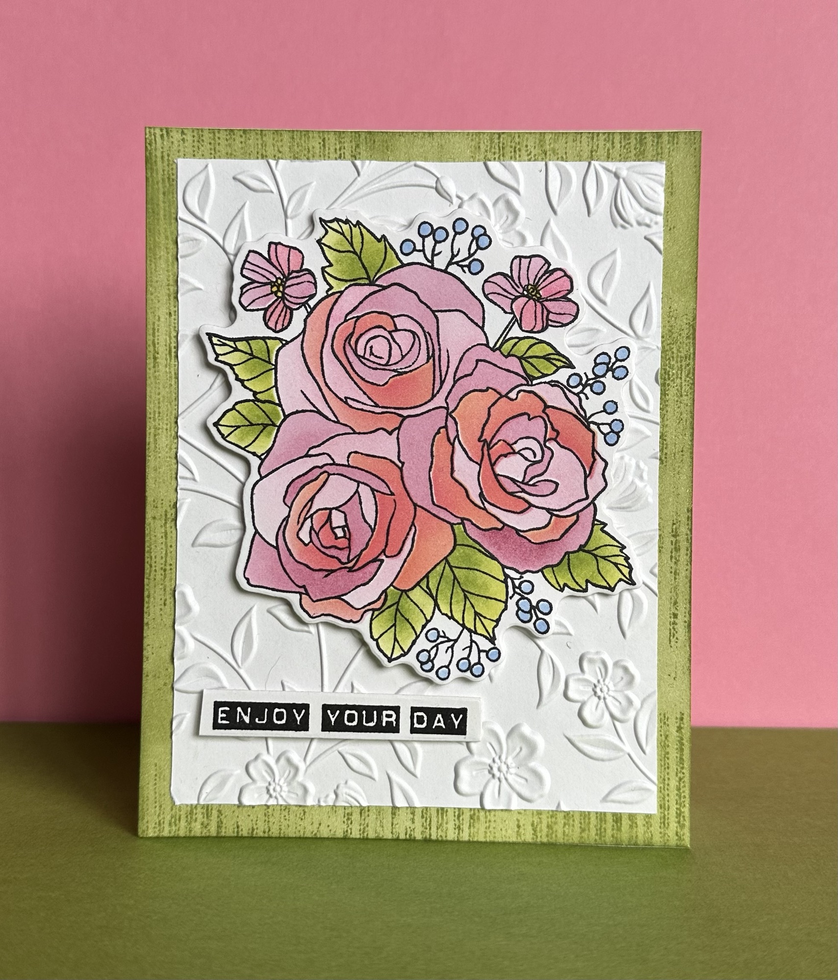 Once all of the coloring was done, I cut the image out with the accompanying die. I selected a sentiment from the set and stamped and die cut it as well. I decided to use the 3-D embossing folder from the new release and kept it white to show off the gorgeous image. To add another layer of color though, I created a striped background using Fern Green Archival ink blended onto white cardstock, and then I stamped it with Wendy’s Ticking background stamp from Stampers Anonymous. After I applied ink to the stamp, I spritzed it with a bit of rubbing alcohol to add a little interest and stamped it onto the green inked paper.