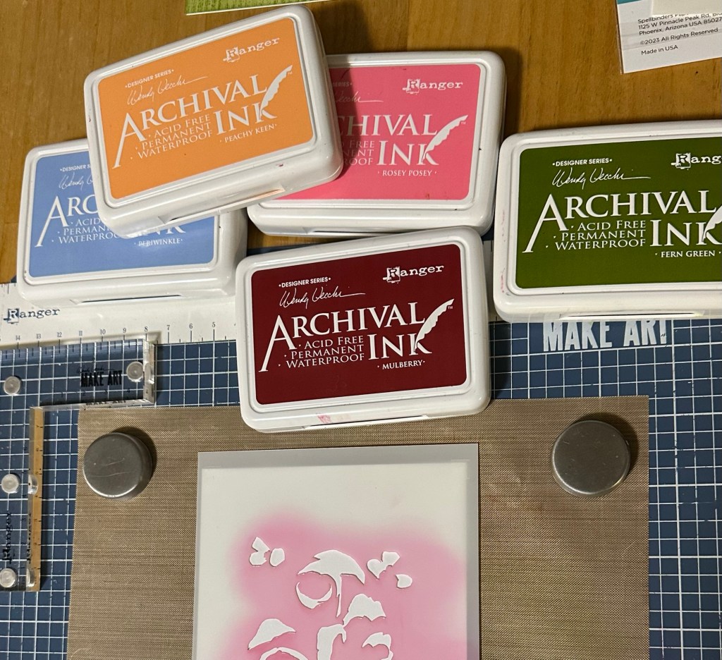 - Inks – Ranger Archival Inks: Fern Green, Mulberry, Peachy Keen, Periwinkle, Prickly Pear, Rosey Posey, and Sunflower