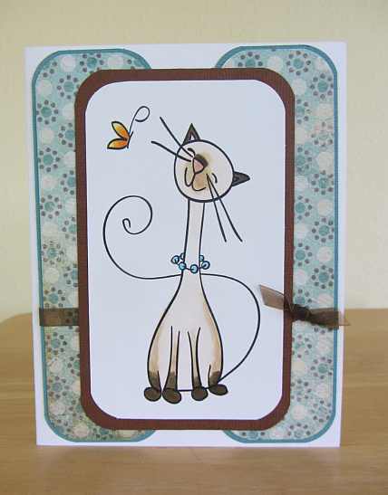I based this card design on the current sketch at CPS (Card Positioning System): Sketch #263. This image is from Crafter’s Digital Art Center Progressive Freebies Challenge #16 and the image is from Just Some Lines. I colored it with Copics in a Siamese-y sort of way! This will be my first card for my next box to go to Operation Write Home. I just shipped 25 cards to OWH on Friday. Thanks for visiting.