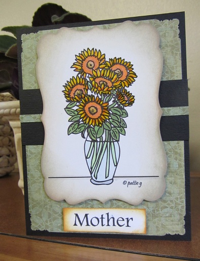 Here is another Mother’s Day card for Operation Write Home. I still need to step it up and make a few more before our deadline that is fast approaching. We want to make sure that our heroes have plenty of cards to send home to their moms. I used one of the current images at Crafter’s Digital Art Center provided by Pattie’s Creations, and colored it with Copics and Glaze pens. The Glaze pens give the petals some shine and dimension that is really nice.