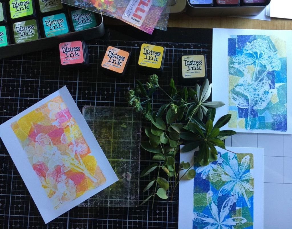 Above you can see the prints I made, using leaves from plants growing in my yard. Nothing exotic, to be sure! The difference in this gel printing experiment is that I used mini Distress Ink cubes direct to the gel plate to create kind of a geometric pattern. I didn’t brayer the ink out, but left it for a more distinct pattern.