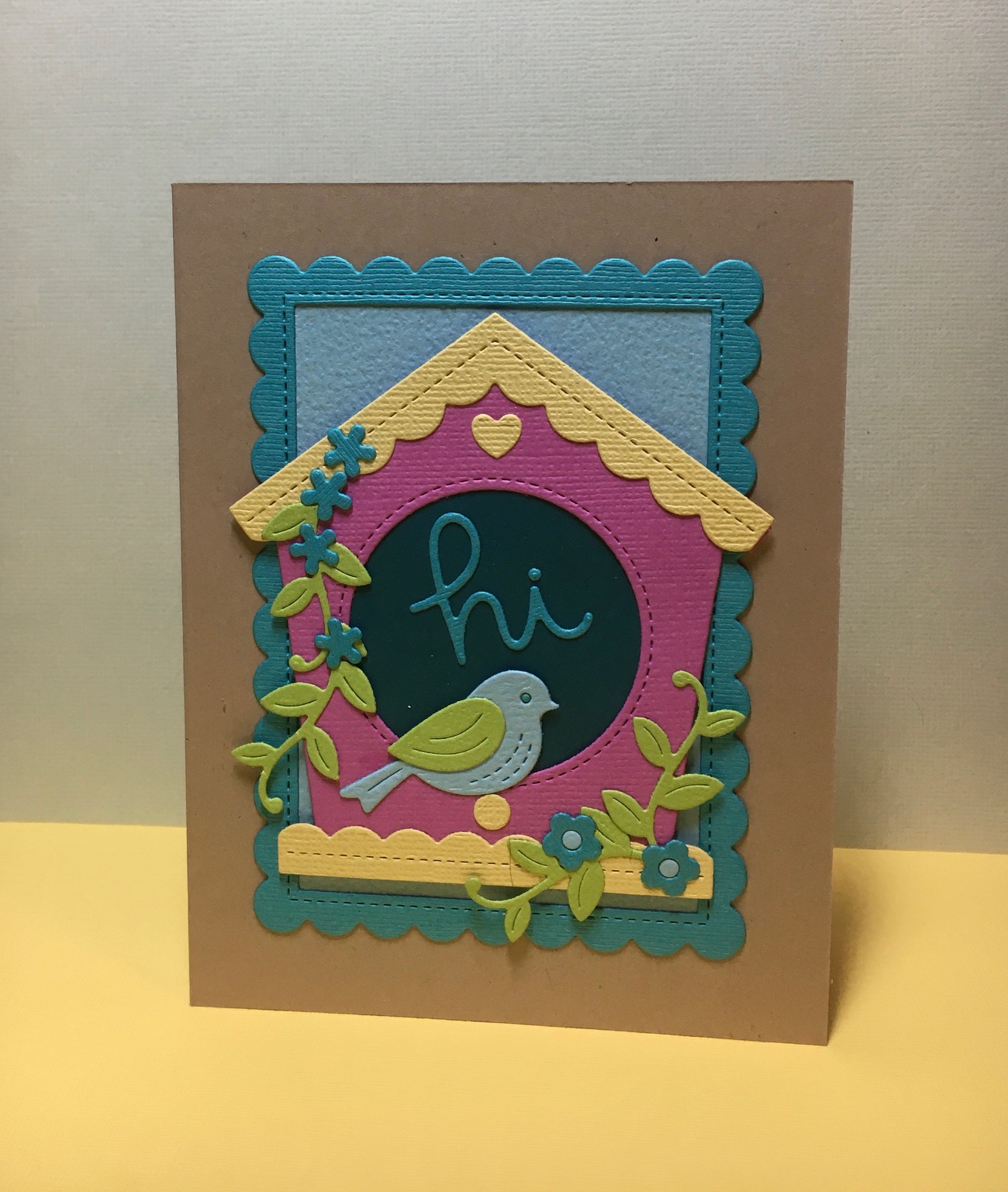 Dies – Lawn Fawn Magic Iris Birdhouse Add-On, Stitched Scalloped Rectangle Frames and Outside In Stitched Bubbles (for the “hi.”)