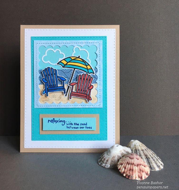 For this card, I created a little scene on the beach. The chairs, umbrella, footprints and sentiment are all from the Cape Code stamp set. I made the sand by adhering a tea bag to white card stock with gel medium to create a little texture and a pretty accurate sand color. I stamped the footprints ever so lightly on the sand since they should only indicate an impression. But they’re so light they are hard to detect in the photo! I had a scrap of the wave patterned paper left from a previous card that I though made a good ocean backdrop.