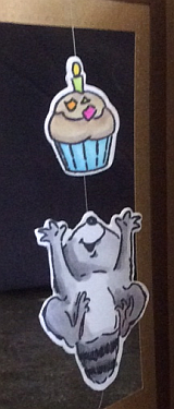 This raccoon is is running up the tree and really trying to take that cake! I stamped the raccoon and cupcake, then colored them with Copic markers. Once that was complete, I die cut them and attached them to the fishing line (these images are two-sided).
