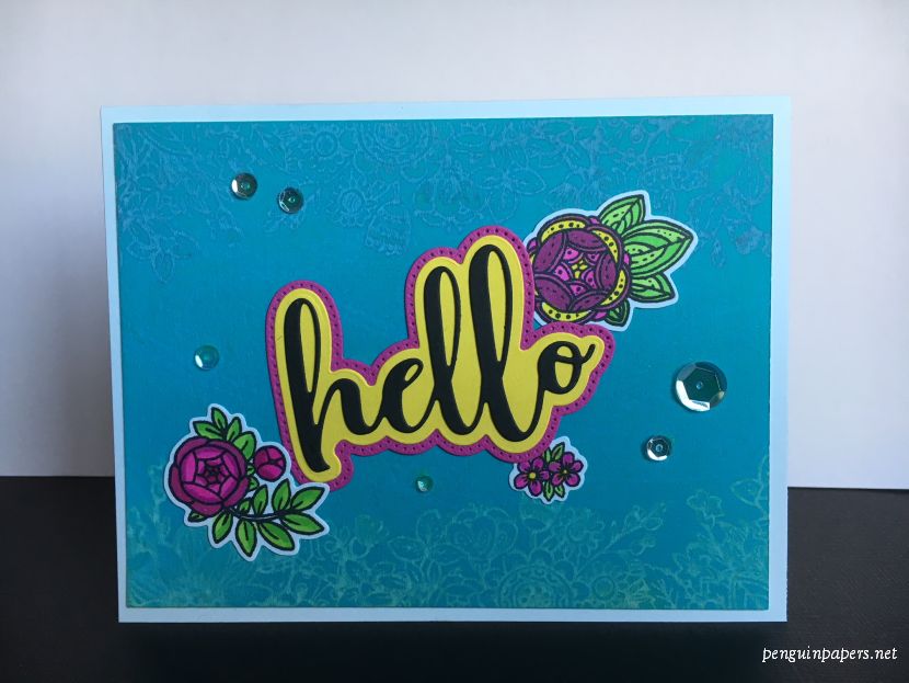 For this card, I used this floral stamp set in two different was. First I created the background, beginning with covering a piece of watercolor paper with Peacock Feathers Distress Oxide ink, direct to paper. This ink covers the paper so smoothly and thoroughly with just a few swipes! I then stamped the border stamp from the Zen Floral set with another color of the oxide inks with a spritz of water, which activates the ink. I used Worn Lipstick ink for the top border and Squeezed Lemonade on the bottom. I then cut the “Hello” die-cuts and stamped and colored more flowers using Copic markers, picking up the colors in the borders. I arranged the flowers and sequins around the greeting. Ta da! Thanks for stopping by.
