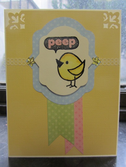 I’m mailing out a shipment of cards to Operation Write Home (OWH) today. The OWH Midweek Throwdown challenge this week is a call for Easter cards. So I stamped this little chick and surrounded it with pastel cardstock and a little bling. It has been so cold that it was fun to create something a little bit Spring-y. Thanks for visiting today!