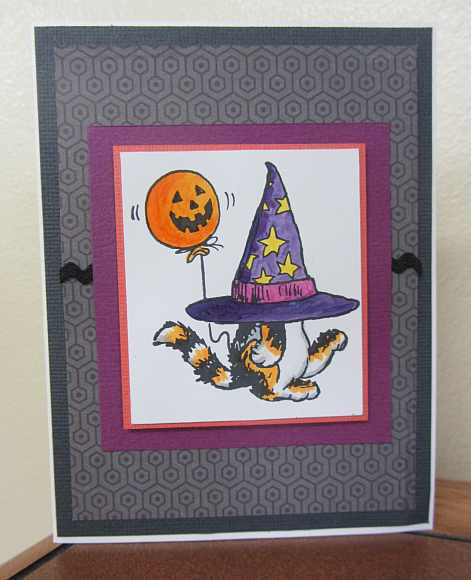 Here we have a nice kitty, all dressed up for Halloween. It fits well with the challenge for Day 298 over at 365 Cards. After stamping the image, I colored it with Copic markers. Layers are in orange and purple and grey, oh MY. Quite Halloweeny! Thanks for visiting.