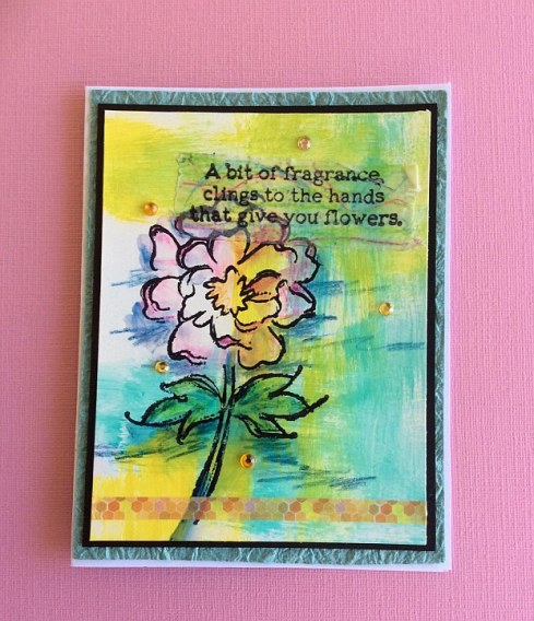 I created this brightly colored, mixed media card by brushing on acrylic paints in the background, and accenting the stamped image with Scribble Sticks. I stamped the quote on Dina’s Media Tape, which is sort of like homemade Washi tape (I scribbled on it also). I added a thin strip of patterned Washi tape I had in my stash as well. I’m entering this card in the Creative Artiste’s Challenge #26, which is to create using mixed media. Thanks for visiting.