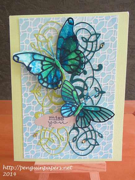 1 Comment | tags: alcohol inks, butterflies, die cuts, memory box, Ranger, stamping, stencils | posted in Miss You, Online Card Classes