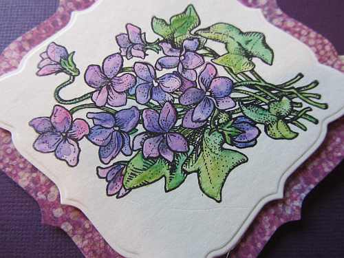 I love a good botanical stamp! This Flourishes stamp is really lovely. I’ve been taking and really enoying the Watercolor for Cardmakers class at Online Card Classes and this was inspired by some of the lessons there. I used watercolor pencils and a water brush to color the image. If you’d like to see a close-up of the violets, see the photo below. Thanks for stopping by.