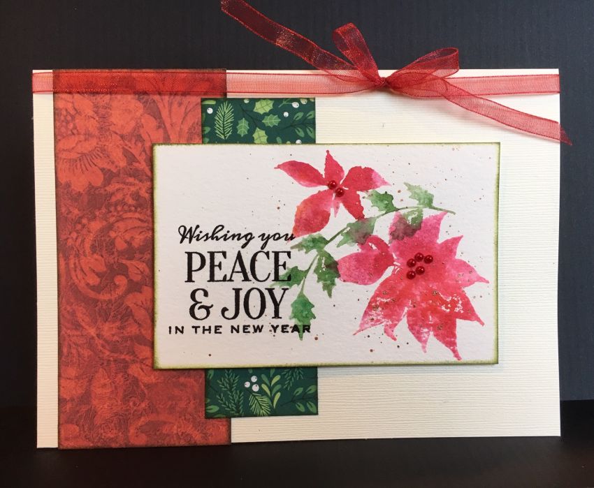 This is another card that I made for the watercolor class I taught at Runaway Art and Craft Studio in Salem. I used the Marvy markers direct to rubber on the poinsettia and holly stamps, then spritzed the stamps with water before stamping for a nice watercolor effect. I heat embossed the sentiment with black embossing powder and spattered the image with some gold metallic paint after adding the red “pearls” to the flower centers. The image is layered on top of some patterned paper strips and all is edged with green ink. Thanks for stopping by.