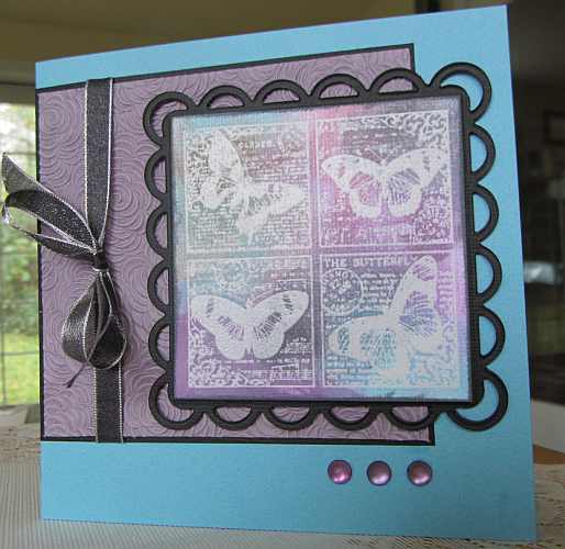 I clear embossed the butterfly image and then applied different colors of ColorBox Chalk inks direct to paper and blended. This card is a sympathy card for a friend whose sister just passed away.