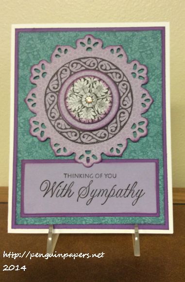I’ve had to make too many sympathy cards lately. For this one, I used a stamp set I’ve had for a long time to create the “rosette.” I stamped the two pieces on a couple of different tone-on-tone patterned papers and then cut out and popped up the pieces in different layers. It made the design a lot more interesting. I then edged everything with some purple chalk ink to tie the pieces together. Thanks for visiting.