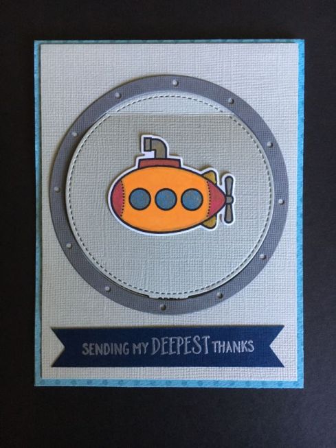 This card was very fun to make. I die-cut the round flap, making a window in the top piece of grey cardstock. I colored my cast of characters with Copic markers and created the scene with the sea creatures in a layer underneath on light blue cardstock and adhered it behind the opening in the grey cardstock. I added the porthole frame around the circle flap and stamped “open” on the flap tab. The tab can then be tucked into the porthole frame. I colored the submarine image with metallic gel pens and adhered it to the outside of the flap. I then stamped and heat embossed the sentiment, adhering it to the bottom of the front panel. I then adhered the grey cardstock to the polka-dot, top fold card base. As always, Lawn Fawn has produced some great stamps and dies to create scenes with. I’m only getting started! Thanks for visiting.