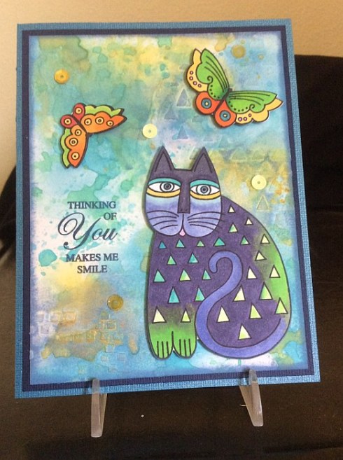 This is a card I entered in the Oregon State Fair Paper Arts competition and it won a first place in the mixed media category. Yay, me! I spent a lot of time layering the Distress Oxide inks and texture paste. The stamp set comes with a stencil that I used, that matches the geometric shapes in the cat stamps. I added the mica spray ink for some shine and contrast. I colored the cat and butterflies with Copic markers, attached them to the background and finished if off with sequins to repeat the yellow from the spray. I really enjoyed making this card and playing with such a variety of media. Thanks for visiting.