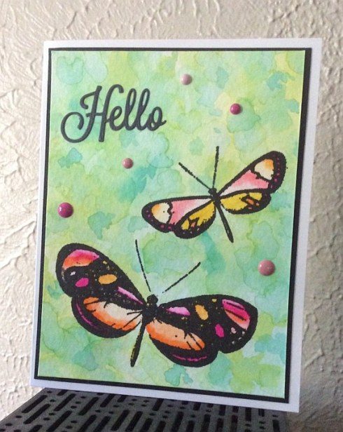 After stamping the butterflies onto watercolor paper, I began watercoloring the background for this card using ink from the Zig Clean Color markers and a waterbrush. I added layers of color until I was happy with the look. Then I colored the butterflies with the markers and waterbrush as well, and added the die-cut and dots. Thanks for visiting.