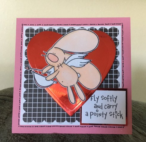 This is a fun card I made with a Valentine set I’ve had in my stash for a while, but I’d never used this particular stamp before! I colored the image with Copics and layered it with some patterned papers I also pulled out. I heat-embossed the sentiment in white on black cardstock and layered it all up. Thanks for visiting today.