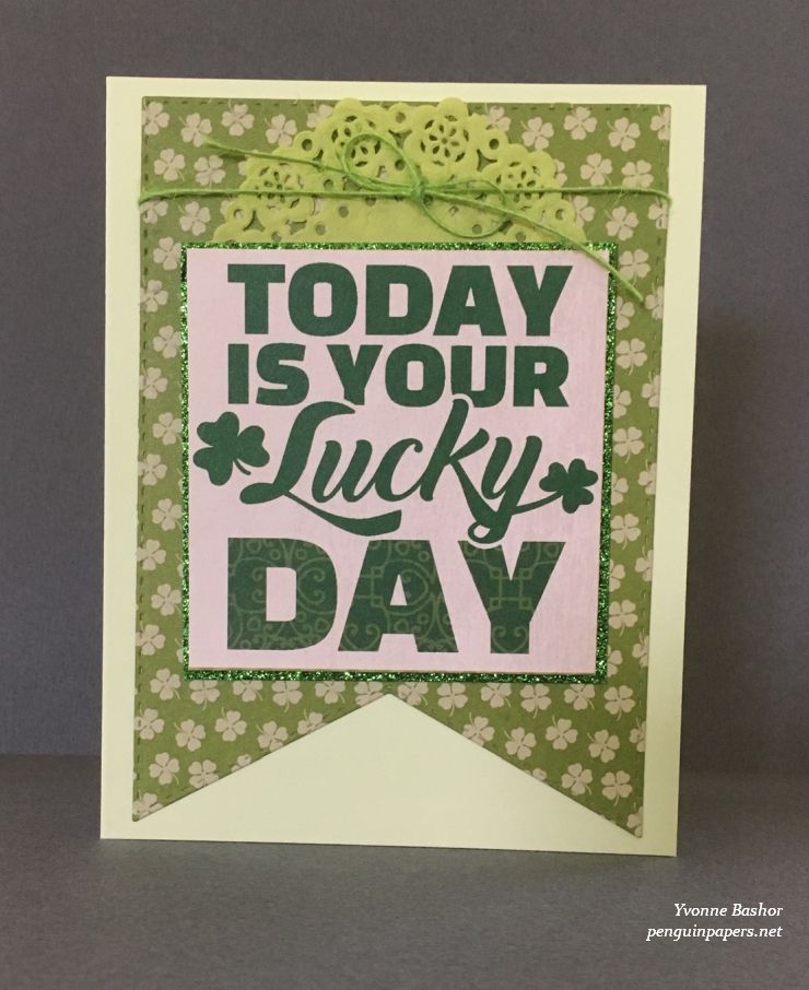 I really like the color green, so when I had a chance to use these Authentique papers to create a card for Runaway Art and Craft Studio, I was excited. This is a very simple card with small touches that make it special: glitter paper matting around the focal image, lovely patterned paper from Authentique, the doily and twine at the top, and that eye-catching banner die-cut I made with the new Art Impressions die. And everything is green! Thanks for visiting today.