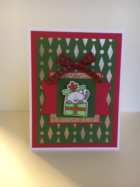 I created this following the sketch for this month’s Inky Paws Challenge 111 on the Newton’s Nook blog. I really liked the layout of this sketch so when I saw it I knew I had to make a card! I colored the kitty with Copic markers and heat embossed some green cardstock with gold embossing powder for some elegant pattern. The really fun thing about this is that I attached an Action Wobble to the cat–so he wiggles! See below for a wiggly video! The small things in life make me happy!