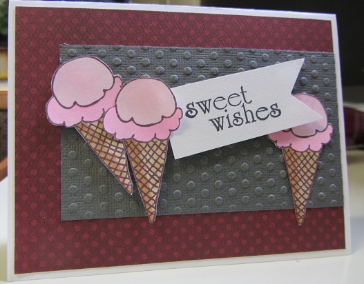 The ice cream cone digital stamp is from Pattie’s Creations, via Crafter’s Digital Art Center’s Progressive Freebie Challenge. I printed and colored three of them with Copic markers and popped them up at different levels. Just a very simple card today. Thanks for visiting.