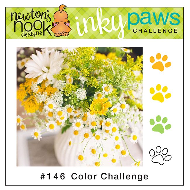 For this card, I colored my image with Copic markers to pick up on the Inky Paws challenge color palette (yellow, orange, green and white) in the current Inky Paws challenge and then found some cute patterned papers in my stash to match. I cut “inchies” from the papers and arranged them and popped them up to create a simple design, which is what I’m drawn to. I inked the edges of every element with Wild Honey Distress Ink to bring it all together.