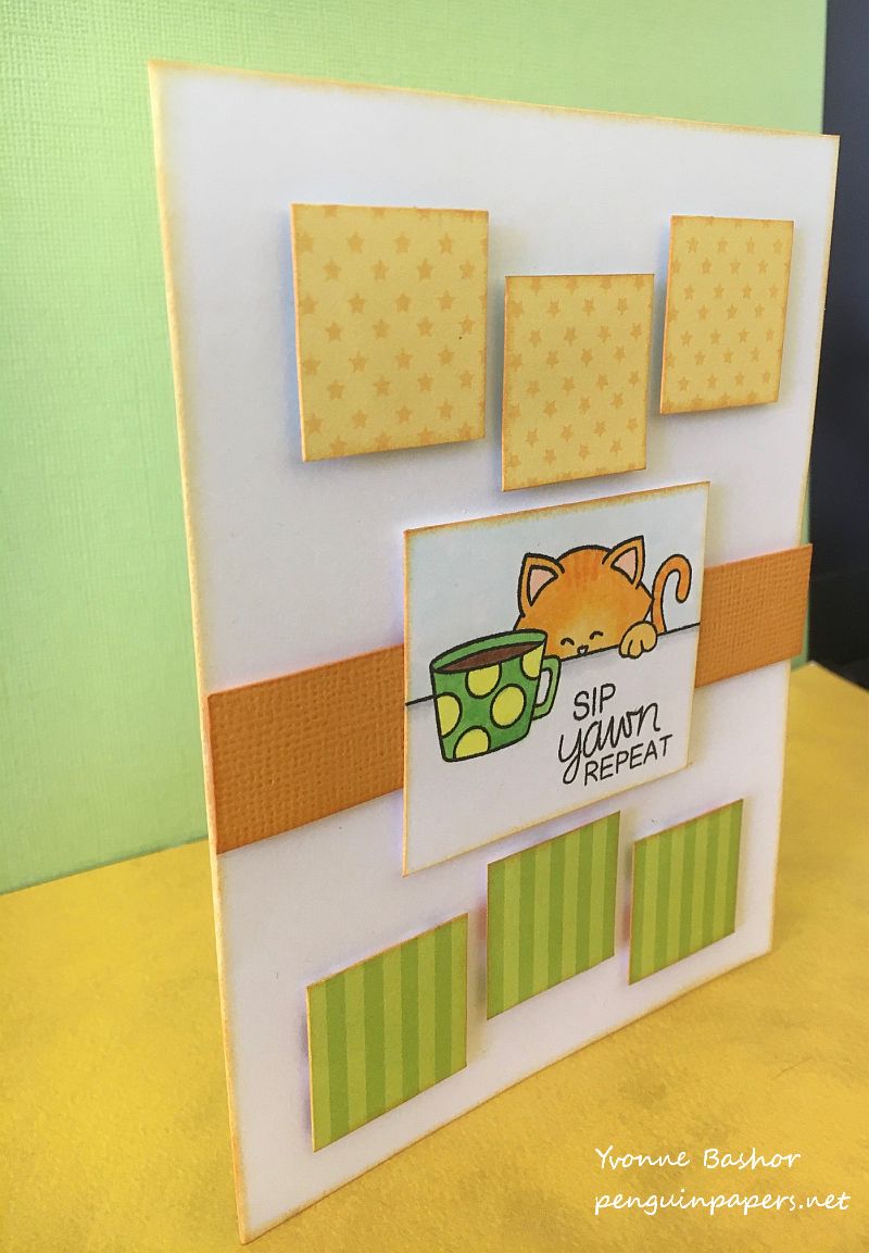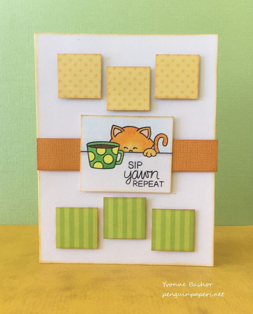 A group of my online cardmaking friends had a challenge this weekend to make coffee cards. This was the stamp set I thought of and one of my favorite stamps. Newton the cat is just so cute in this stamp! Those who know me well, know that I enjoy a couple of cups of coffee in the morning. I’ve never been a morning person, but I can cope with caffeine!