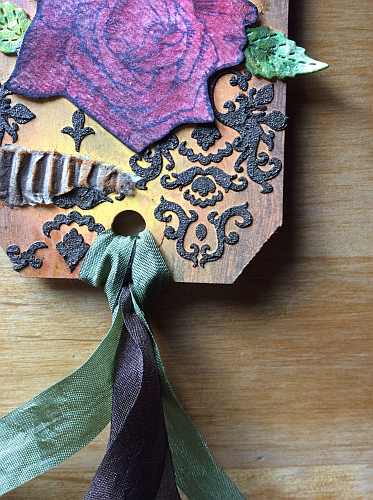 I started out with a plain, manila tag and brushed it with Distress Paints. I then applied Ferro through the stencil for the damask layer. Ferro is thick and has some metallic properties. Its consistency really stands up to a detailed stencil, which you might not expect. I then tore strips from the corrugated cardboard, which had come from the sleeve on my coffee cup! I distressed it with ink before adhering with gel medium. I then added the rose that I had colored on watercolor paper and smoothed out with a baby wipe. I cut the leaves from a scrap from a Gelli Plate print. I distressed the remainder of the elements with walnut stain ink and tied up the tag with the ribbon. I created this for the August Tag Challenge at Mixed Media Mojo.