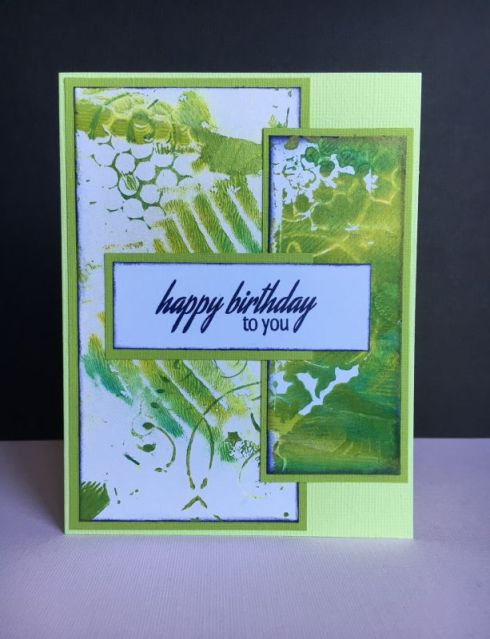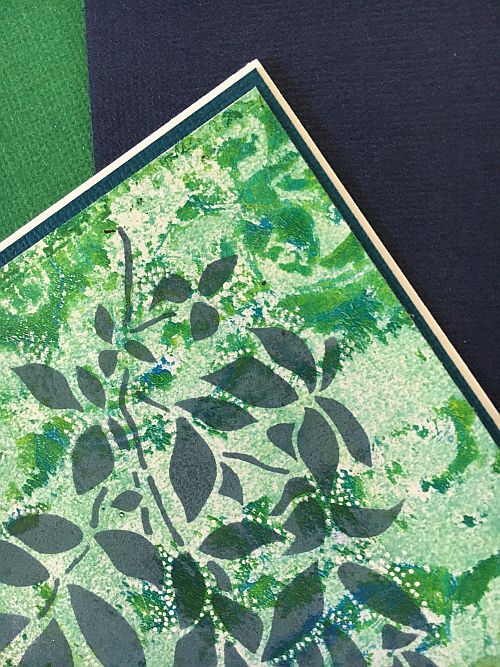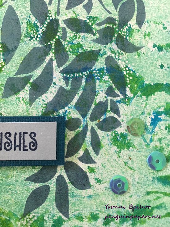 Often when I make cards from gel prints, it is hard for me to cover up the print with a lot of stuff. With this, the leaves (the right-hand leaf) are really the focal point and a simple die-cut sentiment really keeps the card simple and elegant. I added a little ribbon across the top to visually balance out the sentiment, repeated the black with a mat around the print and adhered it all to a navy card base. I added a smattering of epoxy dots I had in my stash and called it done!