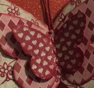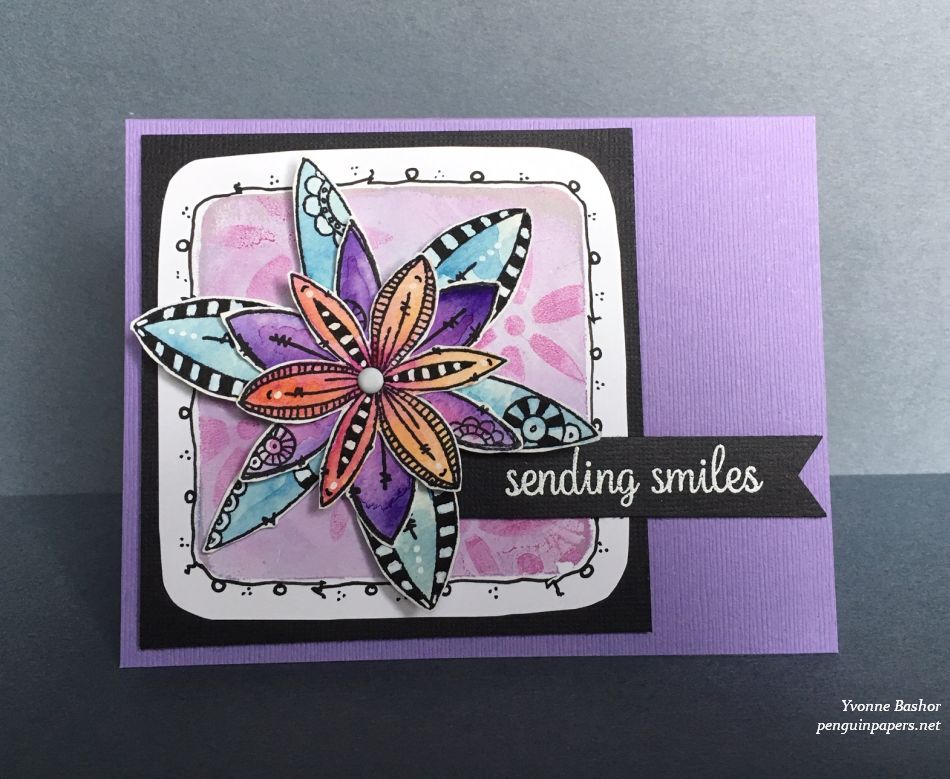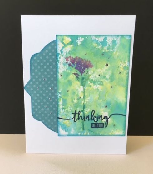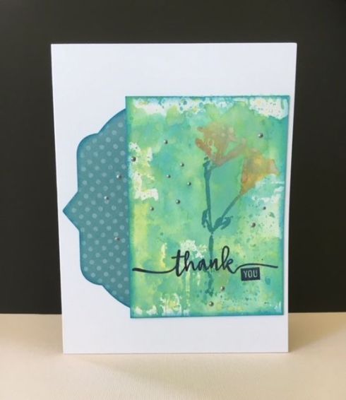 The Distress ink colors I used for all cards blended well together. For this card I ink blended the card base to match one of the stenciled colors (Uncharted Mariner) and then very lightly blended the butterfly image with it as well. This image was stamped with Jet Black Archival ink.