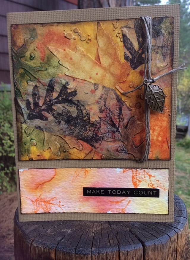 On another scrap of watercolor paper, I watercolored with some Distress Inks and lightly stamped a few more leaves. This was meant to be a background for my sentiment, so I didn’t want my colors to be very intense. One dry, I cut out the sentiment piece, applied Walnut Stain Distress ink to the edges, and popped on the sentiment sticker. I attached the two pieces to cardstock and called it a day. Thanks for visiting.