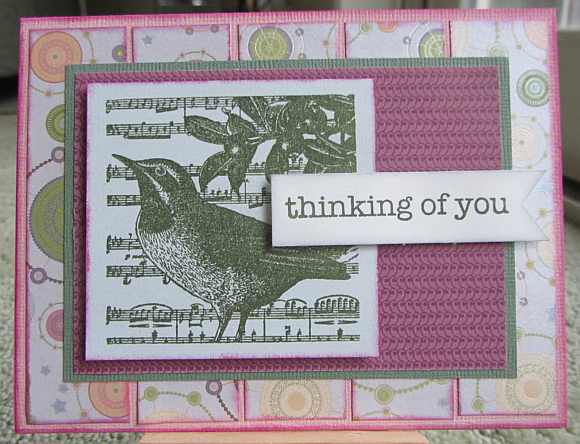 I used the latest sketch at Operation Write Home Stars and Stamps for this card: OWH Sketch #173. The subtle patterns in this paper collection didn’t take too much away from the bird stamp focal point. It also meant I had both flora and fauna elements–what could be better? Thanks for visiting today.