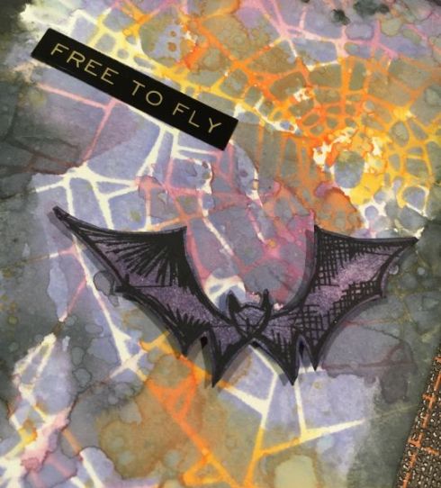 Meanwhile, I stamped the bat in black Archival ink on white cardstock and trimmed away the labeling on the image. I colored it by blending Dusty Concord and Chipped Sapphire (regular) Distress ink to color the bat. I then adhered it to the background with dimensional adhesive. I added the “Free to Fly” sticker to the scene. I assembled the card by adhering the patterned paper to a card base, tying the twine around the top of the bat scene and adhering it all onto the card.