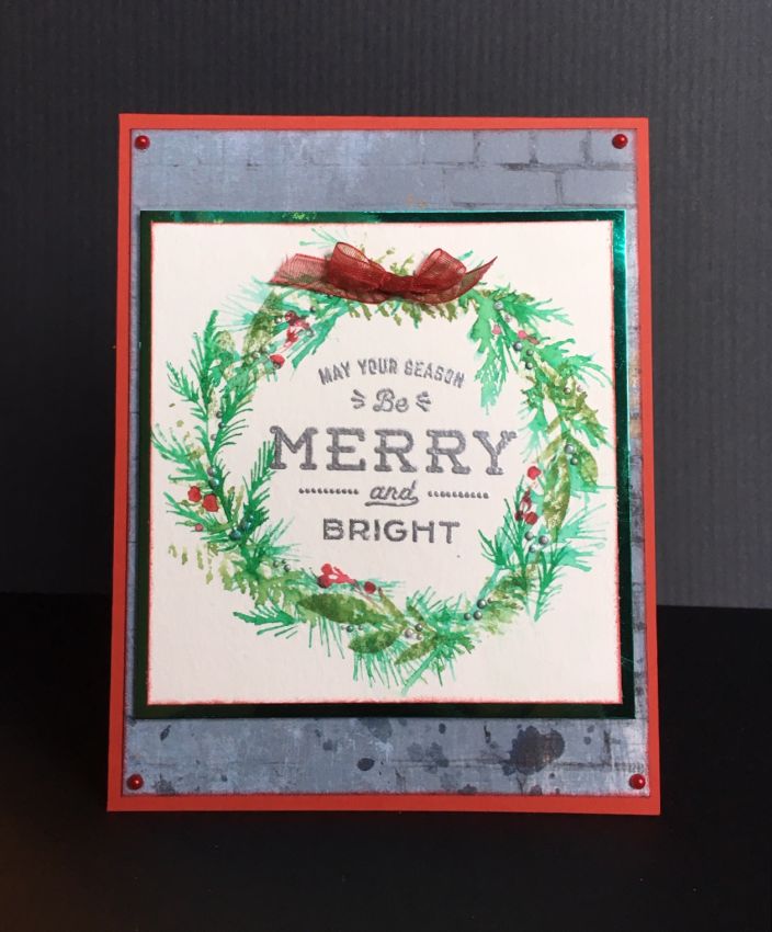 I just finished teaching a class featuring this and two more cards using these stamp sets and a watercolor technique. The watercolor is done using Marvy LePlume II markers direct to rubber and then spritzed with water. Wreath-building is very popular among stampers currently. For this card, I simply penciled in a circle and stamped the greens around it using different marker colors and stamps. It feels just like the process one undertakes when actually creating a wreath for the front door–only quicker! Once the stamping was all complete, I added a few silver Nuvo Crystal Drops for a little shine in a view areas on the wreath. Finally I added a sentiment in the center of the wreath and gave it some more shine with silver heat embossing, plus a bow on top. I should probably put a real wreath up now! Thanks for stopping by.