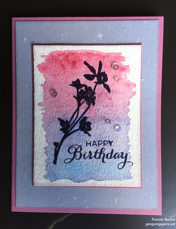 This is a clean and simple card with a bright palette–a fresh look after holiday cards! I created the background using watercolors and blending them vertically. Once it was dry, I stamped the floral silhouette and sentiment onto the watercolored panel and added sequins for some visual interest. I layered the panel onto the subtle patterned paper and a matching card base. Very simple! Thanks for visiting.