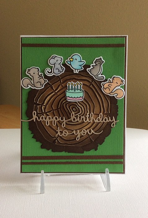 I created this card for my son’s 19th birthday. He likes woodland critters and I gathered rodents and other creatures from a number of stamp sets to get the right combination. It was fun to use the tree stump as the platform for them to dance upon. I cut the “Tree Rings” die from white cardstock, embossed it, and then applied several different Distress inks to get the right coloring. Thanks for stopping by and Happy Birthday, Trenton!